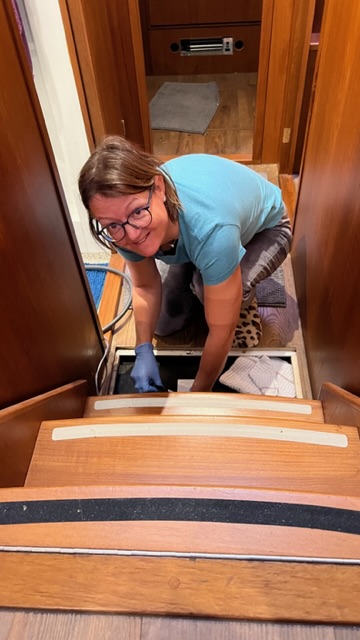 Ich startete damit mit einer alten Wohnmobilpumpe den Fäkalientank vorsichtig auszupumpen. Direkt raus aus dem Bullauge. Das Wasser sah zu Beginn ziemlich sauber aus, doch je näher wir dem Tankboden kamen… nun ihr könnt es euch sicher vorstellen. Trotz allem wesentlich weniger schlimm, als wir ursprünglich befürchtet hatten. Noch etwas spülen und der Tank war sauber.