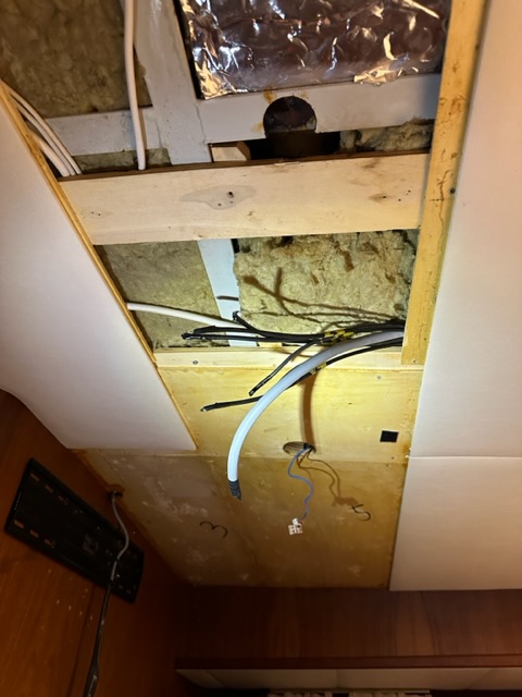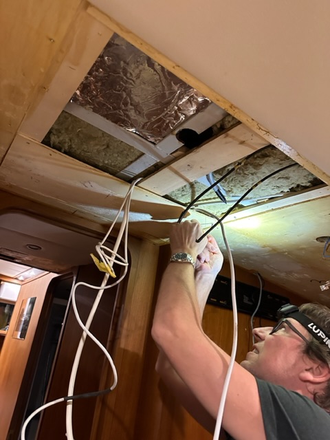 Auf der Suche nach dem TV-Kabel, das ursprünglich vom Salon bis in die Kajüte reichte, öffneten wir die Deckenverkleidung im Schlafzimmer. Dabei fanden wir neben dem erhofften Kabel auch all die alten Kabel, die zum Mast führten. Den liess der Vorbesitzer beim grossen Umbau entfernen – warum auch immer?!