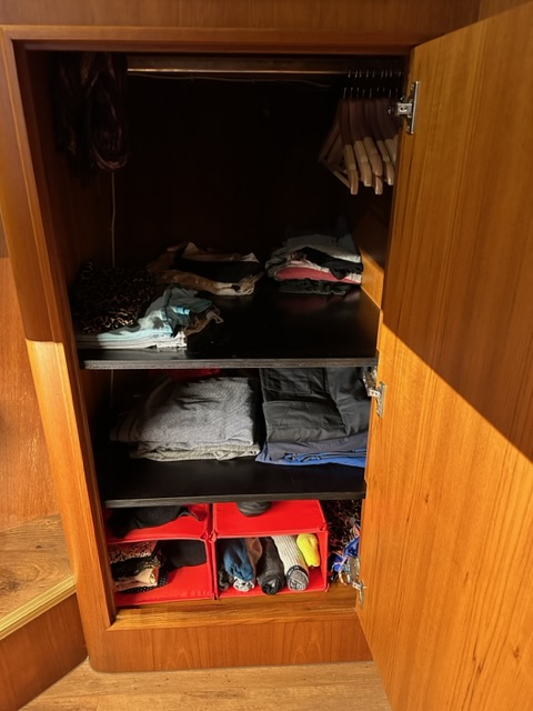 Die neuen Tablare für unsere Kleiderschränke hatten wir vorgefertigt. In meinen Schrank passten die beiden perfekt. Doch wie wir erst jetzt realisierten, ist Christophs Kleiderschrank schmaler. Also nochmals ausmessen.