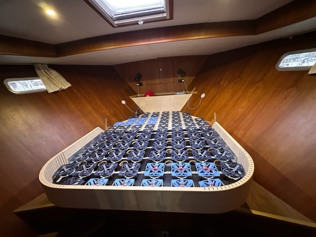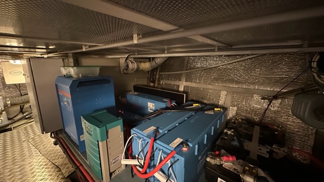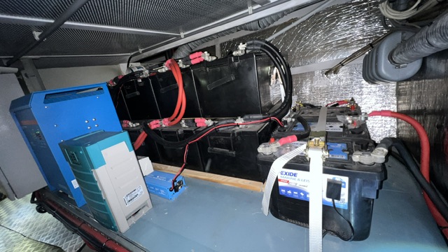 Die drei Neuen sind im Vergleich dazu richtige Leichtgewichte mit je 39kg. Die Tarierungsgewichte unter dem Gästebett mussten wir somit umlagern. Am Besten ganz nach vorne in den Bug, da das Boot hinten sowieso etwas hängt. So weit so gut hatte bis hierhin alles recht gut funktioniert. Doch kurz bevor wir das Abendessen kochen wollten, ging der Strom aus. Totaler Shutdown. Trotz Landstrom alles dunkel. Der Wechselrichter liess nichts durch. Wir wälzten die Gebrauchsanweisungen. So langsam wurde es frisch im Boot, da natürlich auch die Heizung nicht lief. Dank dem Generator erweckten wir die Anlage wieder zum Leben.