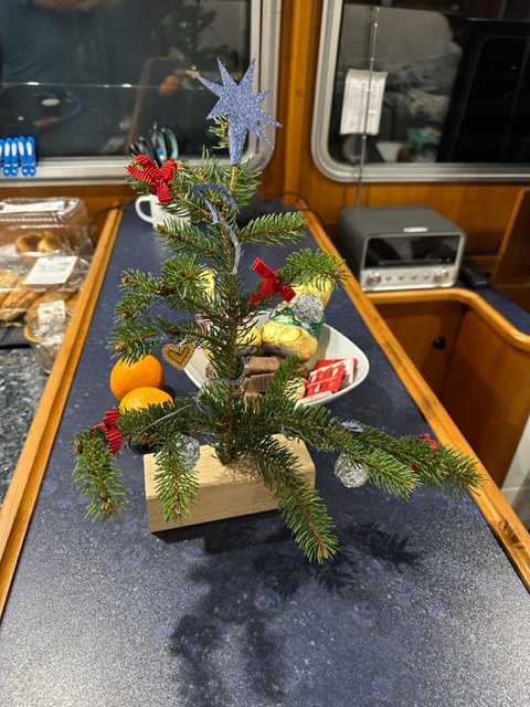 Wenn wir nicht Ausfahren können, dann bleibt uns nichts anderes übrig als zu arbeiten. 😉 Nach unserer Einkaufsrunde durch Baumarkt und Lebensmittelhändler verschwand Christoph am Samstag im Pflichtkeller und baute Regalböden ein. Ich beschäftigte mich derweil mit kleinen Aufgaben. Am Sonntag bauten wir das Bett endgültig um und bei einem Spaziergang ums Hafenbecken „organisierten“ wir uns einen kleinen Weihnachtsbaum.