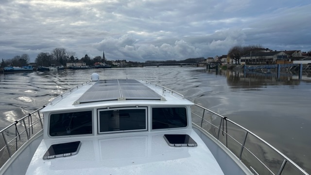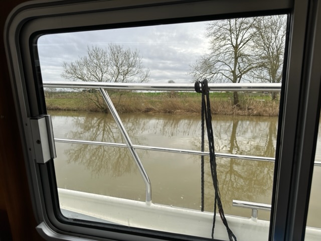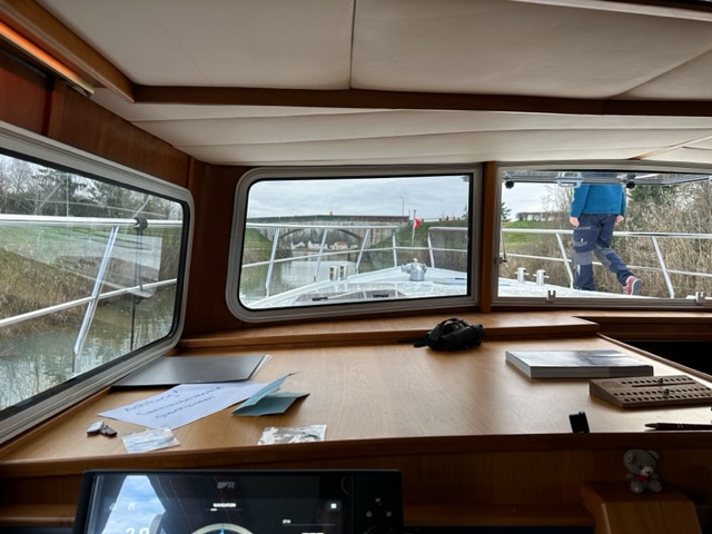 Die Saône war vom Hochwasser braun gefärbt. Wir fuhren bis nach Saint-Symphorien-sur-Saône und zurück. Nur eine kurze Fahrt von 5/4 Stunden aber da jetzt nur wenig los ist und der Hafen ziemlich leer, konnten wir etwas üben. Die Kelpie fährt sich natürlich komplett anders als das Schulboot.