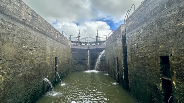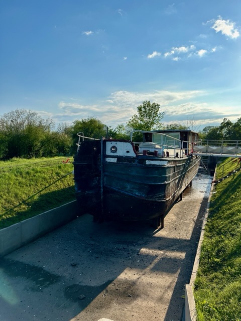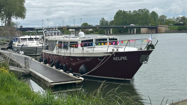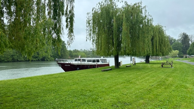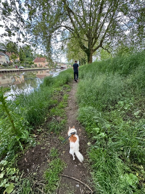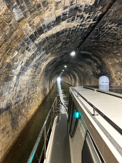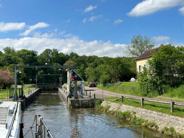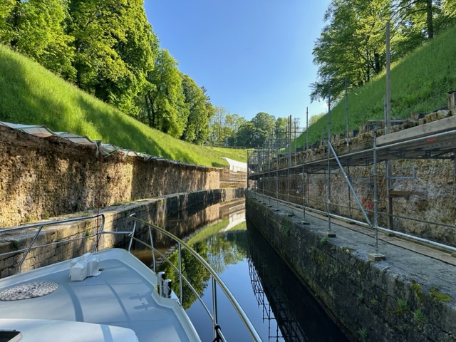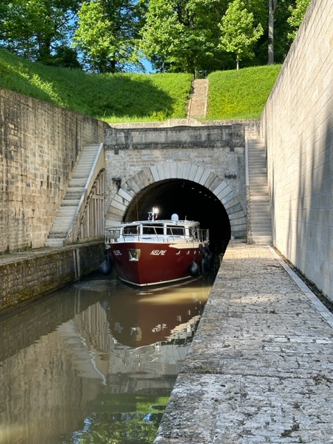Vor dem Tunnel von Savoyeux wurde uns ein Zwangsstopp auferlegt. Ein Stromausfall legte Schleusen und Tunnel lahm. Wir konnten an einer grossen Péniche seitlich anlegen und an uns legte wiederum ein deutscher Segler an. So verbrachten wir eine Nacht bis der VNF die Störung beheben konnte. Etwas umständlich waren hier die Gassigänge mit Ginger. Wir mussten über Geländer und Leitern klettern und uns den Hund abenteuerlich hin und her reichen.
