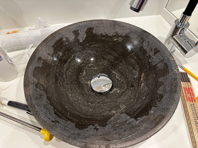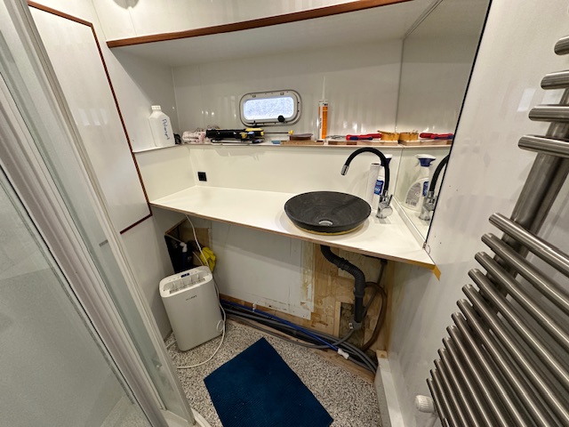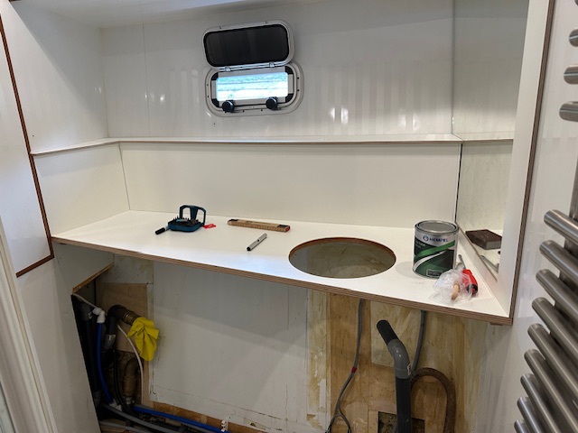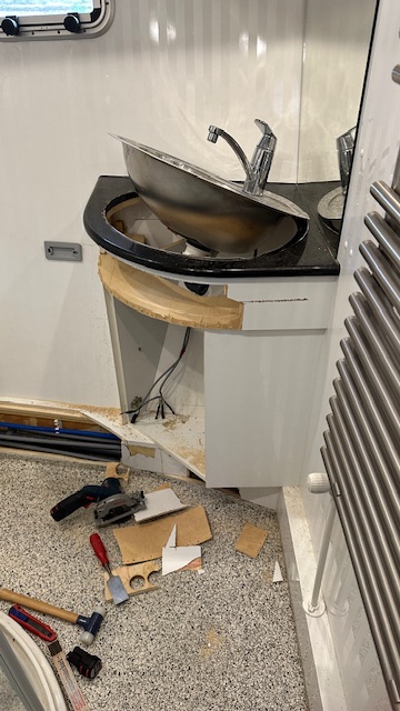Der Badezimmerumbau ging in die nächste Runde. Christoph hatte zuhause die Abdeckung vorbereitet. Mit viel Kraftaufwand riss er das bestehende Möbel raus und passte die neue Ablage inklusive Regal an. Der Unterbau kommt in einem nächsten Schritt.
