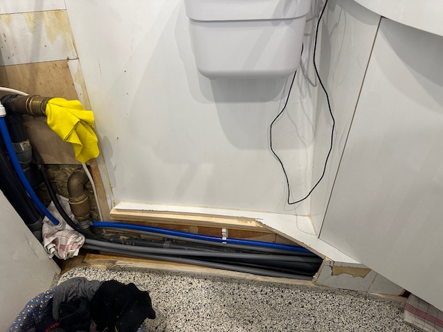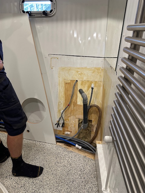 Die Toilettenspülung war bis anhin an der Trinkwasserversorgung angehängt. Dadurch verschwendet man das Trinkwasser regelrecht eimerweise: Auf den 1000 Liter Tank gerechnet waren das etwa 300 Liter! Deshalb haben wir eine neue Wasserleitung verlegt. Die ersetzte Deckwasserpumpe pumpt nun Flusswasser zur Toilette.