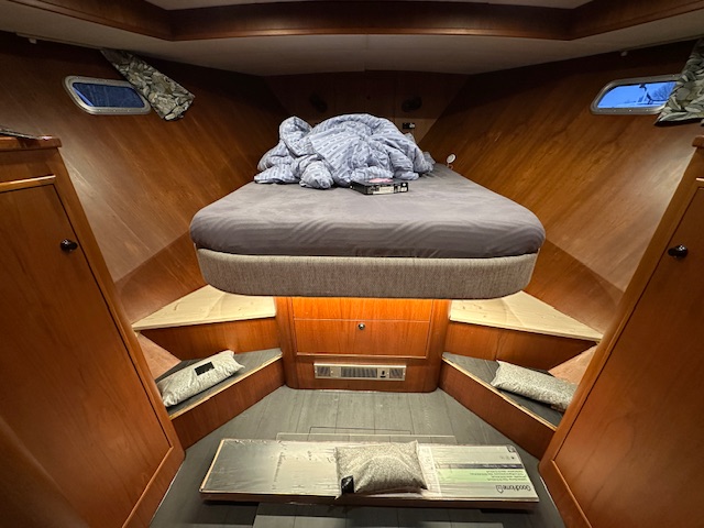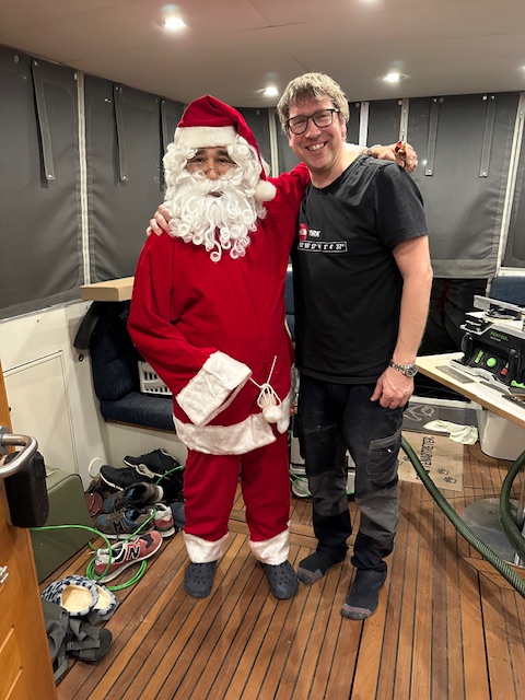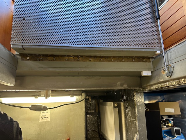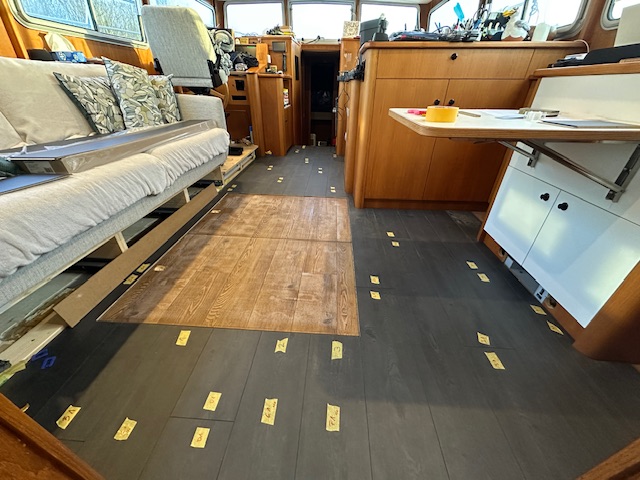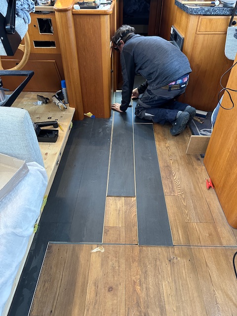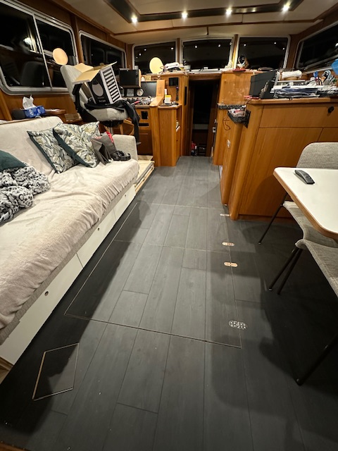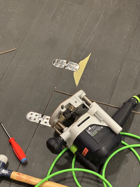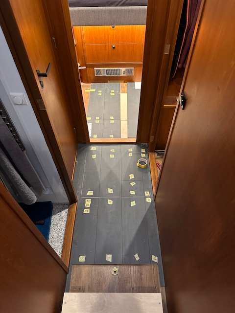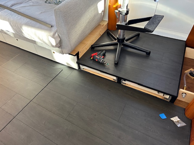 Wir haben das neue Laminat verlegt und damit im Wohnraum angefangen. Etwas kompliziert waren die zu ändernden Bänder der Bodenklappen zum Motorraum. Zufälligerweise kam just unser Nachbar Albert vorbei, als wir sie rausheben mussten. Per Express wurden die neuen Bänder geliefert, da wir die bei unserer Planung komplett vergessen hatten. 😂
