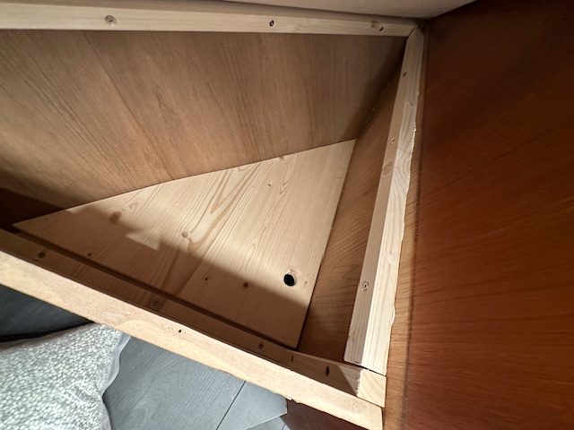 In Gang und Schlafzimmer ersetzten wir die Bodenklappen durch neue. In die obere Treppenstufe beim Bett bauen wir jeweils eine Klappe ein. Dort können wir künftig Bettwäsche verstauen.