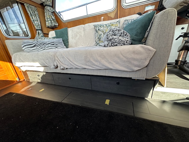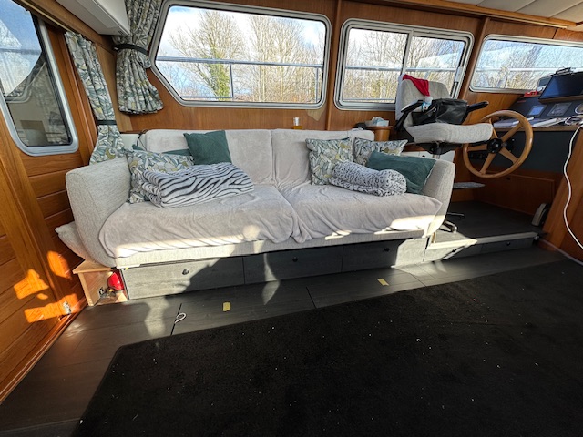 Seit dem Kauf unseres Bootes vor 15 Monaten haben wir sehr viele Arbeiten gemacht. Viel Kosmetik, Refreshs und auch grössere Umbauten wie zum Beispiel das Sofa, Bett und Badezimmer. Wir haben unserer Kelpie innen einen neuen Look verpasst. Gerade der Wohnraum wirkt durch den neuen Fussboden, die Ablageflächen und Vorhänge wie ein anderes Boot.