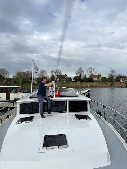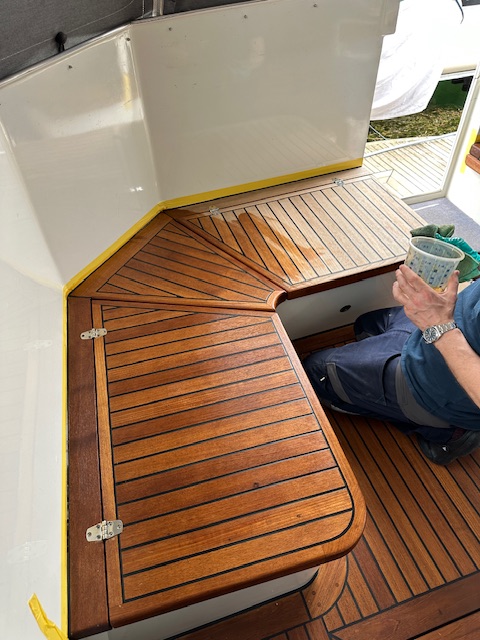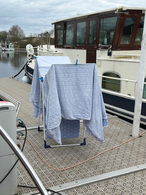 Das Wetter war erfreulicherweise viel besser. Aber selbstverständlich regnete es genau dann, als wir die Bettwäsche zum Trocknen nach draussen gebracht hatten. 🥴😂 Christoph ölte das Teak der Sitzbank, da es nun vier Wochen Zeit hat zu trocknen. Ansonsten waren wir ziemlich faul und genossen ein entspannendes Wochenende.