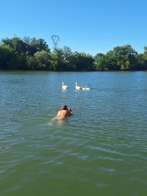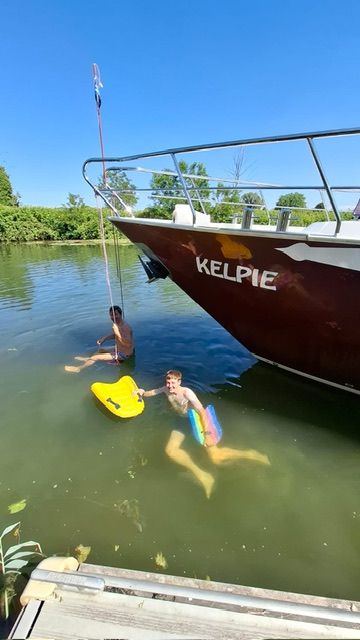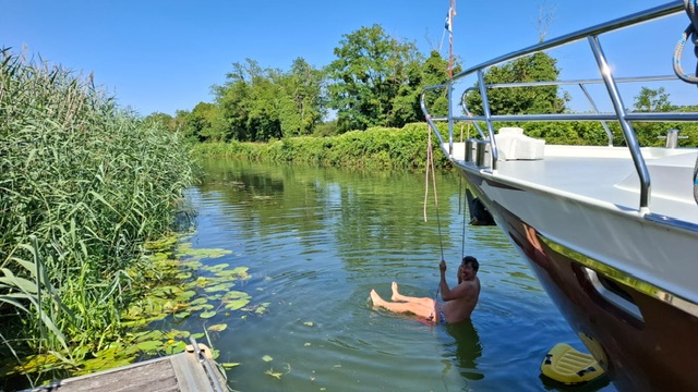 Christoph war am Samstag als einziger früh wach, wir andern schliefen lange aus. Vor dem Frühstück gingen wir, wie bei unserem letzten Besuch hier, Brombeeren pflücken. Die wanderten dieses Mal direkt in den Tiefkühler, bis wir die Muse finden etwas daraus zu machen. Nach einem ausgiebigen Frühstück fuhren wir am Nachmittag wieder zurück. Christoph wollte die Nacht auf der Saône ankern. Nachdem wir ein schönes Plätzchen gefunden hatten, mussten wir uns im kalten Nass abkühlen!