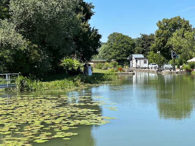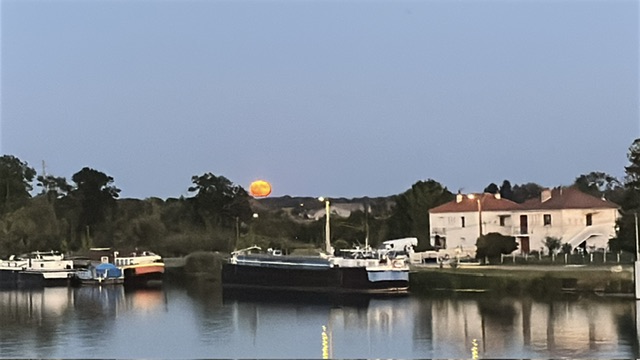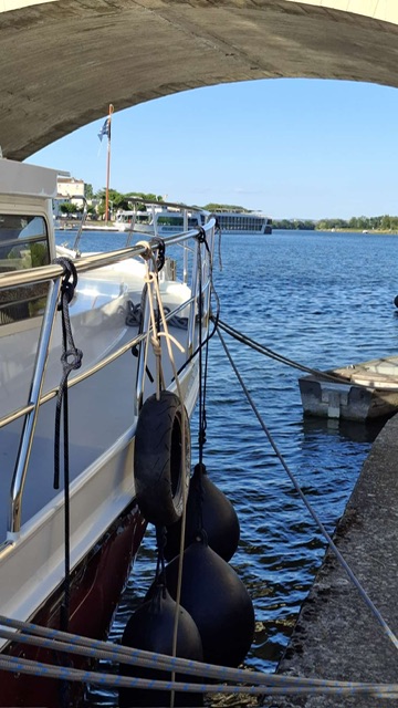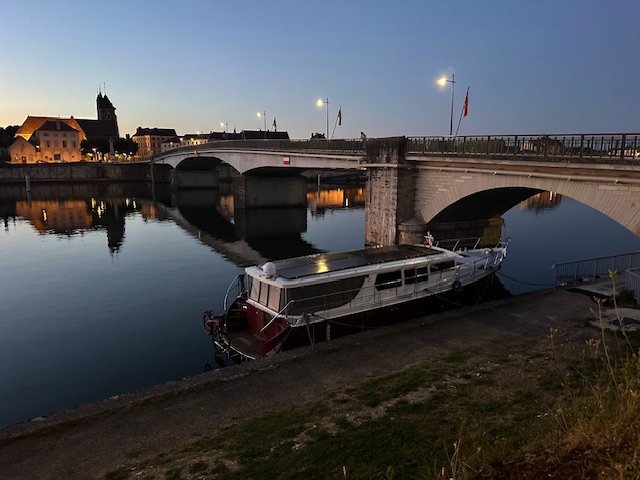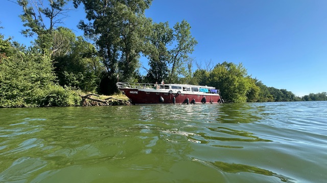 Kurz darauf frischte der Wind auf, der unsere Kelpie hin und her drückte. Wir schauten in der Wind-App und mussten feststellen, dass der Wind nachts dreht und die Kelpie mitten in die Saone drücken würde. Wir beschlossen deshalb uns ein anderes Plätzchen zu suchen. Im Grünen setzen wir das Boot bewusst in den Sand. Hier stand sie sicher die Nacht über.