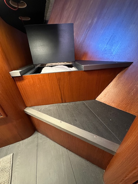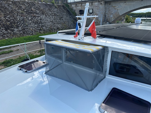 Für das grosse Frontfenster und die beiden Seitlichen habe ich uns Mückennetze genäht. Befestigt werden sie mit Magneten. Es hat erstaunlicherweise praktisch nie Stechmücken an Bord aber auch andere Fliegen werden abends durch Licht angezogen.