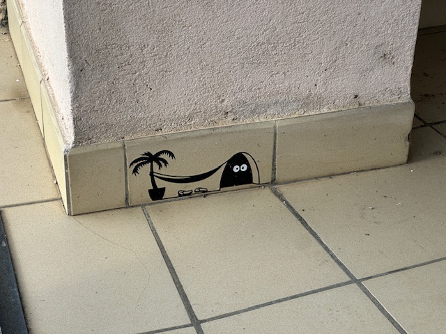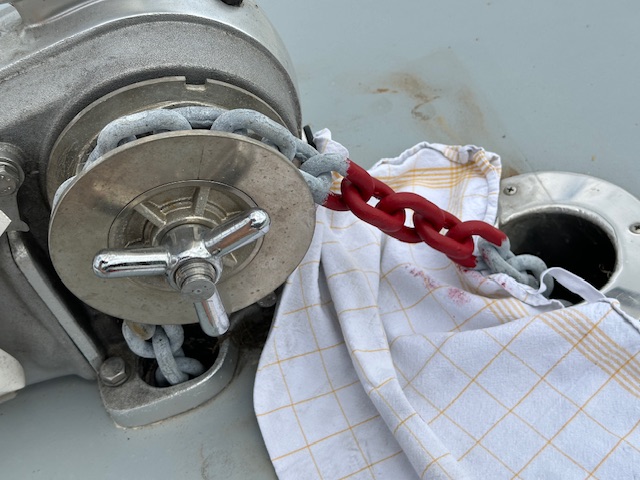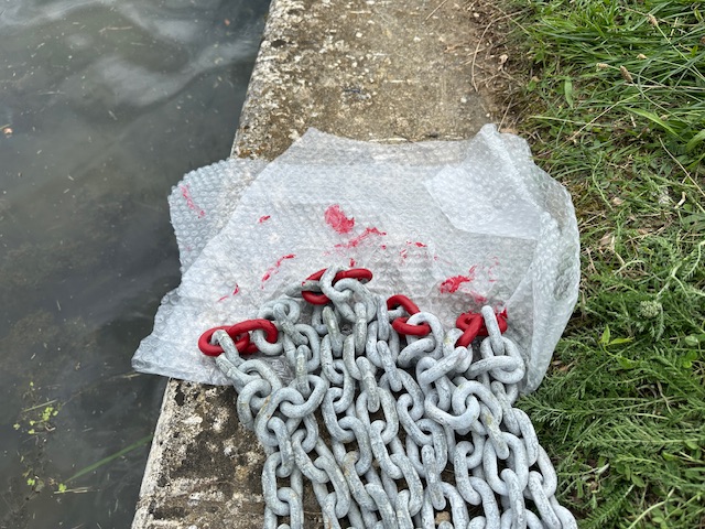 Wir haben die Ankerkette komplett an Land gelegt und vermessen: es sind 45m, das reicht uns. Nun haben wir alle 5m eine Markierung gemalt. So wissen wir in Zukunft beim Ankern wie viel Kette wir tatsächlich geben. Ich war gerade am pinseln als sich zwei Fussgänger ankündigten. Es dauerte einen Moment, bis ich sie erkannte: Frederick und Corinne von der Aquarius, die wir vergangenen August in Choisey kennenlernen durften. Nach einem Schwatz mussten sie wieder weiter. Aber wir haben uns sehr gefreut, dass sie extra angehalten haben, als sie die Kelpie gesehen haben.
