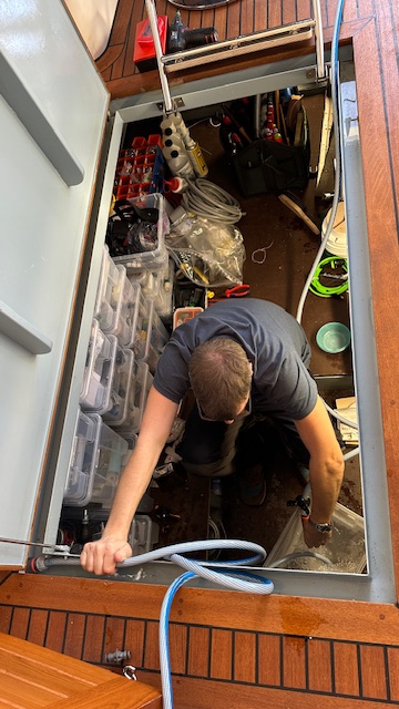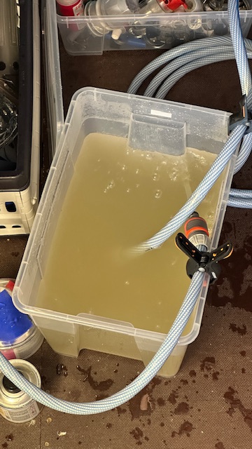 Anfang März, während unserem letzen Besuch auf der Kelpie haben wir die Trinkwasserleitungen gereinigt. Christoph installierte dazu einen Wasserkreislauf. So konnte er die Reinigungsmittel mehrmals durchlaufen lassen. Eine ganz schön unappetitliche Brühe. 🤮