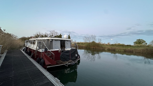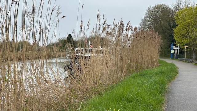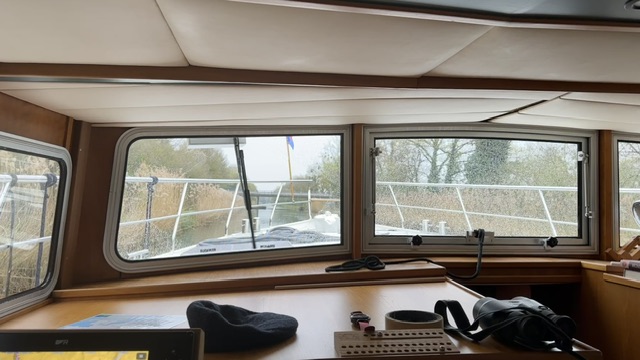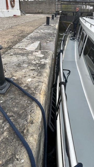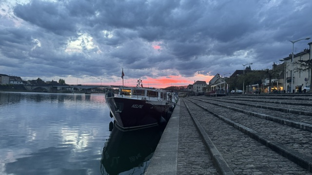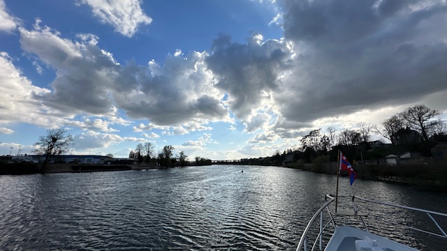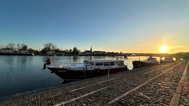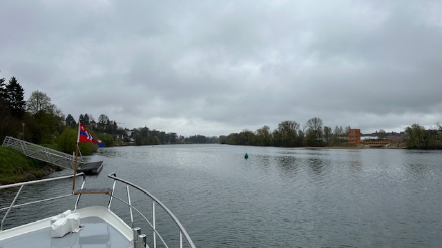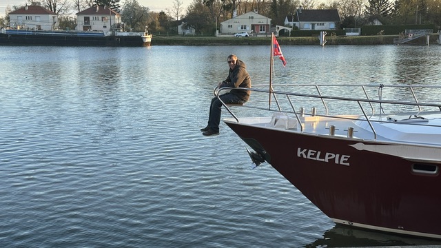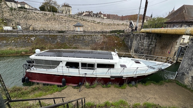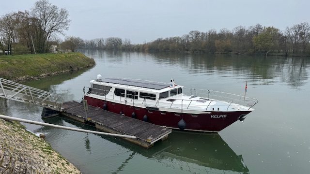 Eine Stunde später wendete Christoph die Kelpie, um am Steg von Choisey anzulegen. Während dem Wendemanöver verweigerte das Heckstrahlruder unerwartet seinen Dienst. Nachdem wir die Kelpie festgemacht hatten, gingen wir dem Problem auf den Grund. Wir checkten Sicherungen, Leitungen usw. und kamen zu dem Schluss, dass wohl der Motor hopps gegangen ist. 😩 Wir hielten mit dem Chefmechaniker der H2O Rücksprache und der kam zum selben Ergebnis. Leider ein schlechter und teurer Aprilscherz! Selbst reparieren ist nicht, da das gute Stück unter Wasser liegt.