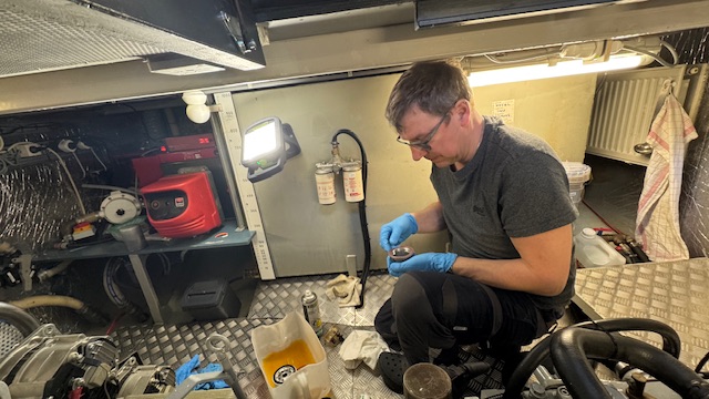 Anschliessend kam die Heizung dran. Den Dieselfilter der Heizung konnten wir nicht wechseln, da die neuen Filter ein anderes Gewinde hatten. So wie der derzeitige Filter aussah wurde der – vermutlich aus diesem Grund – die letzten Jahre nie gewechselt. 🥴 Einspritzdüse und Zündkerze bereiteten keine Schwierigkeiten. Richtig lustig wurde es, als Christoph einen kleinen Filter fand, der in der Anleitung nirgends erwähnt wurde. Schlussendlich konnte er alles wieder zusammen setzen und die Heizung sprang sauber an.