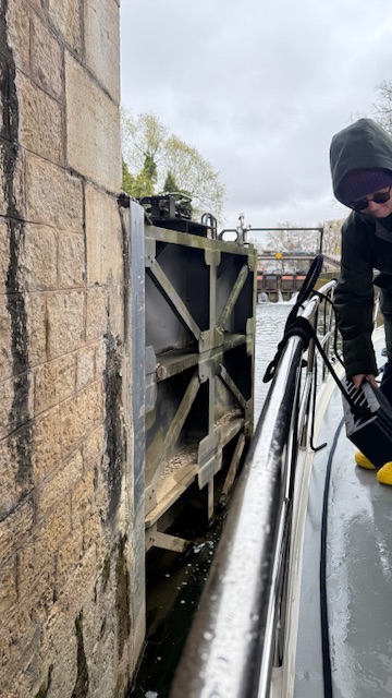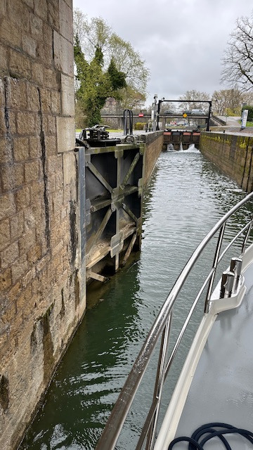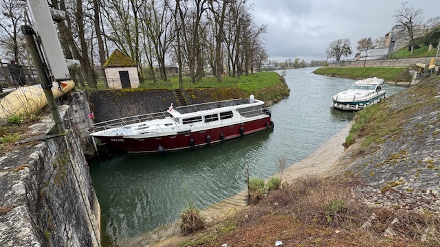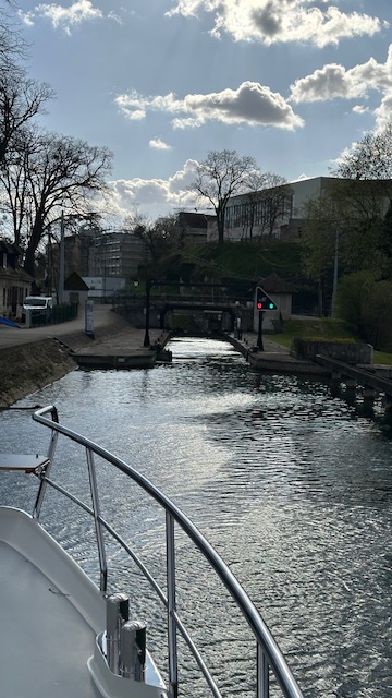 Am Montag fuhren wir weiter nach Dole. Bei der letzten Schleuse öffnete sich die eine Tür nicht vollständig. Es hatte sich ein Stück Holz dahinter verkeilt. Wir probierten, ob wir trotzdem durch passen, mussten aber feststellen, dass es zu schmal war. Also wieder zurück und direkt vor dem Tor festgemacht. Ich ging von Bord zum Schleusenhäuschen um den VNF zu alarmieren. Keine fünf Minuten später erschien eine nette Dame und löste das Problem vor Ort.
