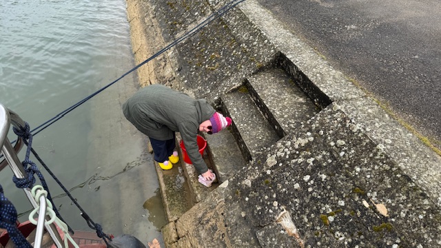 Nachdem wir am Freitag unser Material auf die Kelpie gehievt hatten, fuhren wir aus dem Hafen an den Quai. Auf dem Weg dahin legten wir einen Tankstopp ein. Der Diesel hat hier noch nicht aufgeschlagen! Während wir ein paar Stunden zuvor unser Auto zu €2.22 betankt hatten, kostete der Diesel hier noch €1,89 und das obwohl der Diesel am Wasser sonst immer ca. €0.20 mehr kostet. Gemäss dem Motto: günstiger wird’s vorerst nicht mehr, füllten wir unsere Tanks auf.