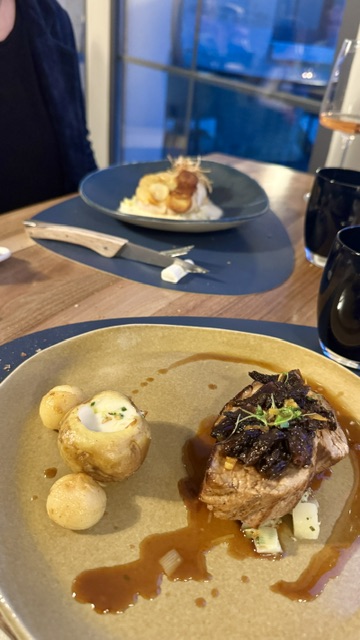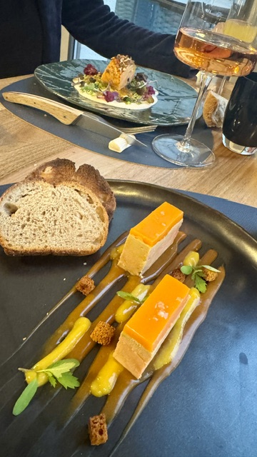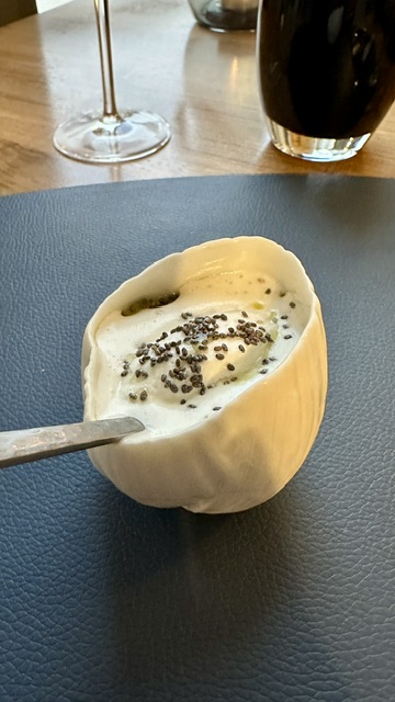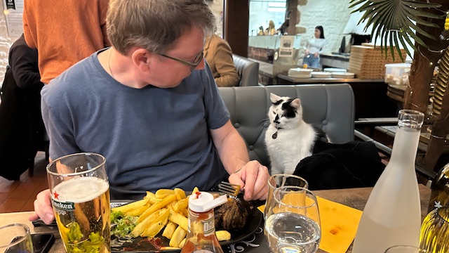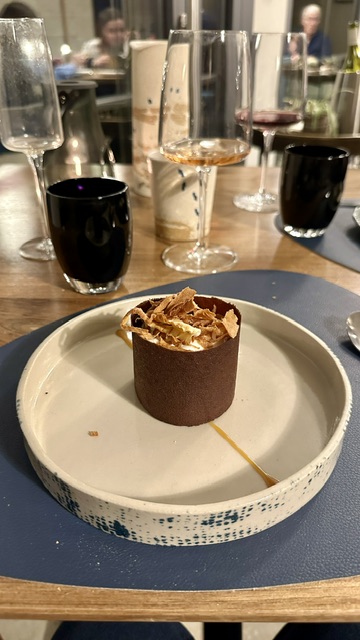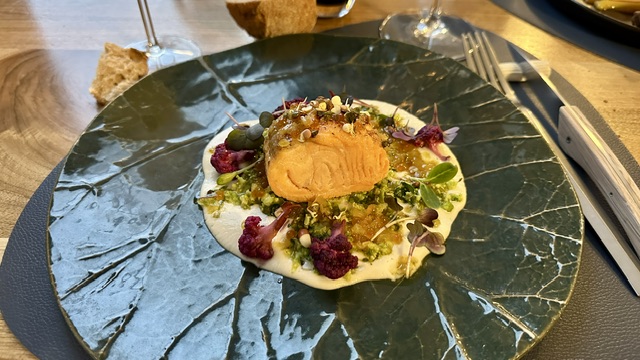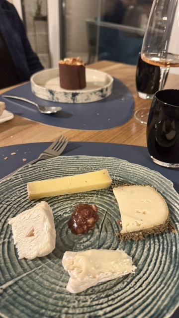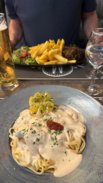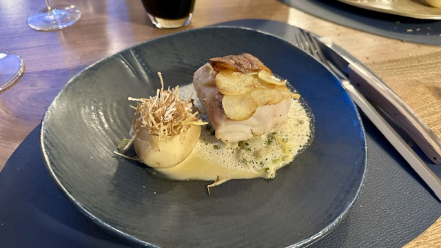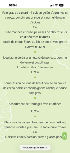 Nach dem anstrengenden Tag im Motorraum hatte sich Christoph ein Abendessen im Restaurant Grain de Sel (übersetzt Salzkorn) gewünscht. Wir hatten es bei einem Abendspaziergang durchs Dorf entdeckt. Die Karte ganz nach unserem Geschmack: ein 3 Gang-Menü mit jeweils zwei Wahlmöglichkeiten. Mehr Auswahl gibts nicht. Und unsere Erwartungen wurden nicht enttäuscht.